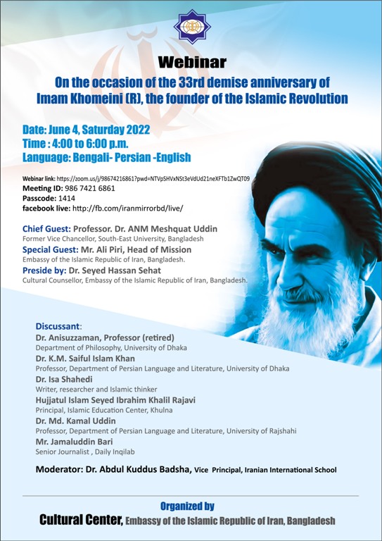 ইসলামি বিপ্লবের রূপকার ইমাম খোমেইনী (রহ.)-এর ৩৩ তম মৃত্যু বার্ষিকী উপলক্ষে আজ বিকেল ৪ টায় এক ওয়েবিনার অনুষ্ঠিত হবে। ঢাকাস্থ ইরান সাংস্কৃতিক কেন্দ্রের উদ্যোগে আয়োজিত ওয়েবিনারে প্রধান অতিথি হিসেবে উপস্থিত থাকবেন সাউথ-ইস্ট বিশ্ববিদ্যালয়ের সাবেক উপাচার্য প্রফেসর ড. আ ন ম মেশকাত উদ্দিন। বিশেষ অতিথি হিসেবে উপস্থিত থাকবেন বাংলাদেশে অবস্থিত ইসলামি প্রজাতন্ত্র ইরান দূতাবাসের হেড অব মিশন জনাব আলী পিরি।