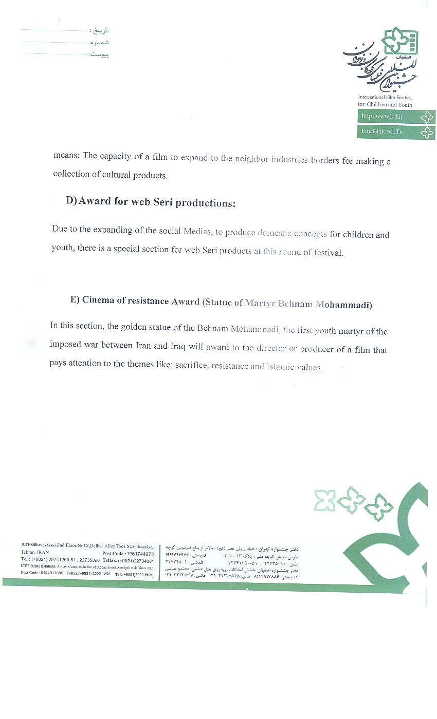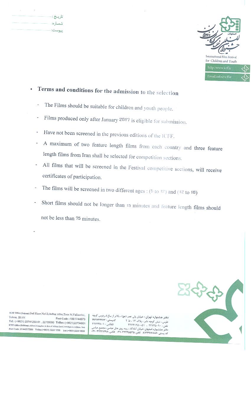 উৎসবে অংশগ্রহণের নিয়মকানুন ও সময়সীমা সম্পর্কে বিস্তারিত জানতে আইসিএফএফ এর অফিসিয়াল ওয়েবসাইট www.icff.ir এ প্রবেশ করুন। সূত্র: মেহর নিউজ এজেন্সি।