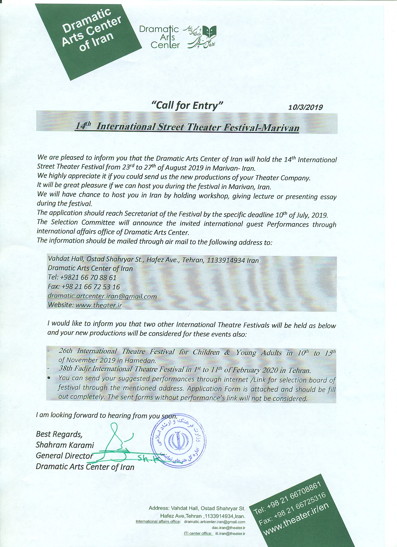 আবেদনপত্র ও আনুষঙ্গিক বিষয়াদি ড্রামাটিক আর্টস সেন্টারের ইন্টারন্যাশনাল অ্যাফেয়ার্স অফিস (ভাহদাত হল, ওস্তাদ শাহরিয়ার স্ট্রিট, হাফিজ অ্যাভিনিউ, তেহরান) বরাবর পাঠাতে অথবা এই নাম্বারেdramatic.artcenter.iran@gmail মেইল করতে বলা হয়েছে। ওয়েবসাইটের ঠিকানা, থিয়েটার ডটআইআর, টেলিফোন- +৯৮২১৬৬৭০৮৮৬১।