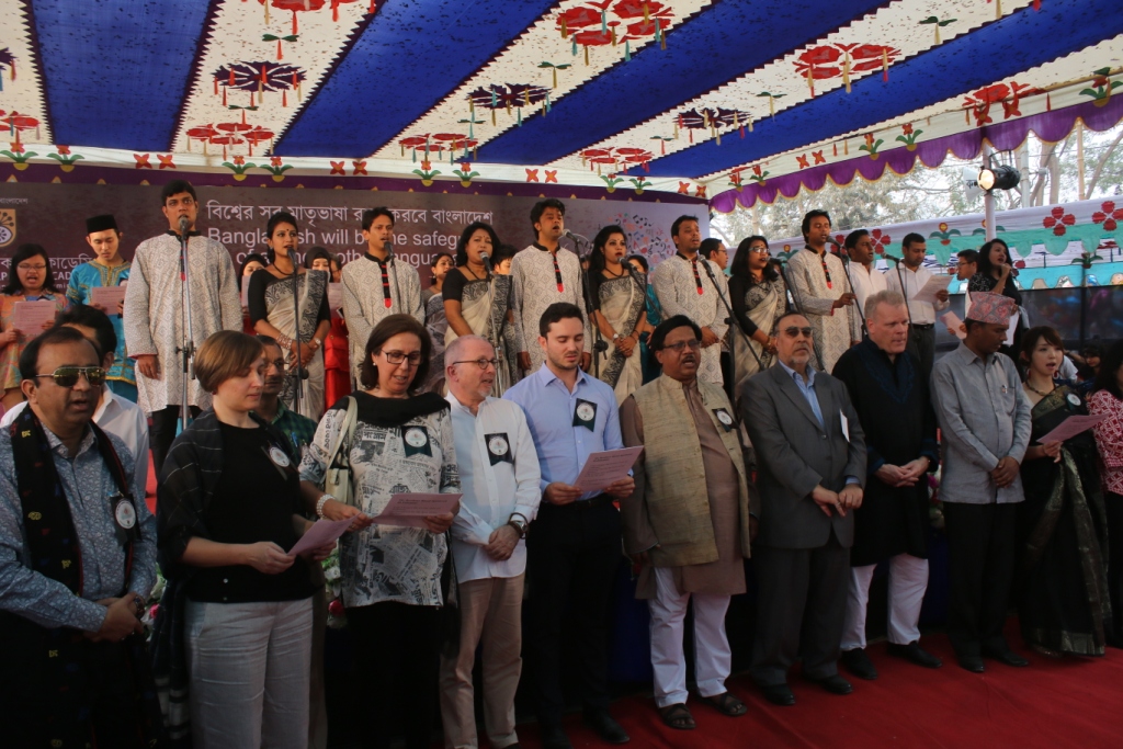 অনুষ্ঠানের শুরুতে লিয়াকত আলী লাকী বলেন, ‘মাতৃভাষা রক্ষার দাবিতে আন্দোলন করতে গিয়ে আমাদের সূর্য সন্তানরা শহীদ হয়েছেন। এটি শুধু দুঃখের বিষয় নয়, একই সঙ্গে গৌরবেরও। আমরা সারা দুনিয়ার মাতৃভাষা রক্ষার বিষয়ে উদাহরণ তৈরি করেছি।’ অনুষ্ঠানে ফিলিপাইনের রাষ্ট্রদূত ভিসেন্ত ভিবেনসিও তি বানদিলো তাঁর দেশে ১০০-এর ওপর ভাষা রয়েছে উল্লেখ করে ফিলিপিনো ভাষায় একটি কবিতা আবৃত্তি করে শোনান। ডেনমার্কের রাষ্ট্রদূত মিকাইল এইচ উইনথার ঢাকা নিয়ে ইংরেজি ভাষায় নিজের লেখা একটি গান গেয়ে শোনান। নেপালের রাষ্ট্রদূত থান বাহাদুর ওলি নিজের লেখা বাংলা কবিতা পড়ে শোনান। অনুষ্ঠানে ইরানের কালচারাল সেন্টারের শিল্পীরা ইরানি ভাষায় গান গেয়ে শোনান। ইন্দোনেশিয়ার একটি দল অনুষ্ঠানে নৃত্য পরিবেশন করে। অনুষ্ঠানের শুরুতে দেশি ও বিদেশি অতিথিরা ‘আমার ভাইয়ের রক্তে রাঙানো একুশে ফেব্রুয়ারি’ গানটি গান। অনুষ্ঠানে ফ্রান্স, ভারত, জাপান, দক্ষিণ কোরিয়ার প্রতিনিধিরা অংশ নেন।
