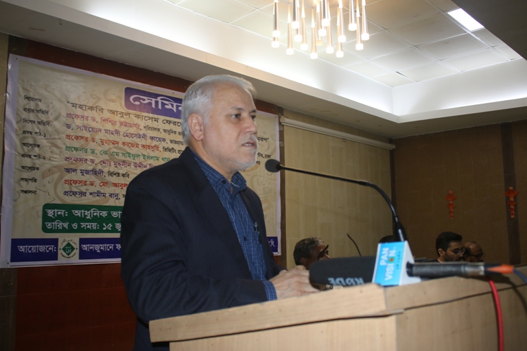 আনজুমানে ফারসি বাংলাদেশ ও ফারসি প্রোগ্রাম, আধুনিক ভাষা ইনস্টিটিউটের যৌথ উদ্যোগে আয়োজিত সেমিনারে প্রধান অতিথি হিসেবে উপস্থিত ছিলেন ঢাকা বিশ্ববিদ্যালয়ের আধুনিক ভাষা ইনস্টিটিউটের পরিচালক প্রফেসর ড. শিশির ভট্টাচার্য। বিশ্ববিদ্যালয়ের ফারসি ভাষা ও সাহিত্য বিভাগের চেয়ারম্যান প্রফেসর ড. আবুল কালাম সরকারের সভাপতিত্বে অনুষ্ঠানে বিশেষ অতিথি হিসেবে উপস্থিত ছিলেন ঢাকাস্থ ইসলামি প্রজাতন্ত্র ইরানের সাংস্কৃতিক কেন্দ্রের ভারপ্রাপ্ত কালচারাল কাউন্সেলর ড. মাহদী হোসেইনী ফায়েক।অনুষ্ঠানে ‘ওমর খৈয়ামের কবিতায় আনন্দ ও মুহূর্তকে কাজে লাগানোর দর্শন’ শীর্ষক প্রবন্ধ উপস্থাপন করেন বিশিষ্ট ফারসি গবেষক ও ঢাকা বিশ্ববিদ্যালয়ের ফারসি ভাষা ও সাহিত্য বিভাগের ইরানি ভিজিটিং প্রফেসর ড. কাজেম কাহদূয়ী।