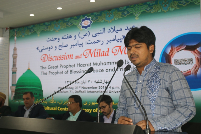রাজধানীর ধানমন্ডিস্থ ডেফোডিল ইন্টারন্যাশনাল ইউনিভার্সিটির মিলনায়তনে বধুবার ‘মহানবী হযরত মুহাম্মাদ (সা.) : রহমত, শান্তি ও বন্ধুত্বের নবী’ শীর্ষক এক আলোচনা অনুষ্ঠিত হয়েছে। ঢাকাস্থ ইরান সাংস্কৃতিক কেন্দ্রের উদ্যোগে আয়োজিত অনুষ্ঠানে প্রধান অতিথি হিসেবে উপস্থিত ছিলেন সাউথইস্ট ইউনিভার্সিটির ভাইস চ্যান্সেলর প্রফেসর ড. এ.এন.এম মেশকাত উদ্দিন।